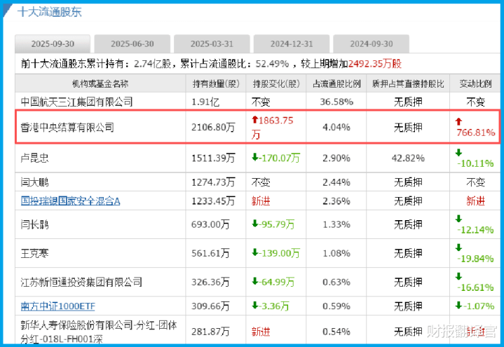 然而,下一页的“资本行动记录”却让人瞳孔一震:香港中央结算有限公司(北向资金)在报告期内,持仓暴增767%。